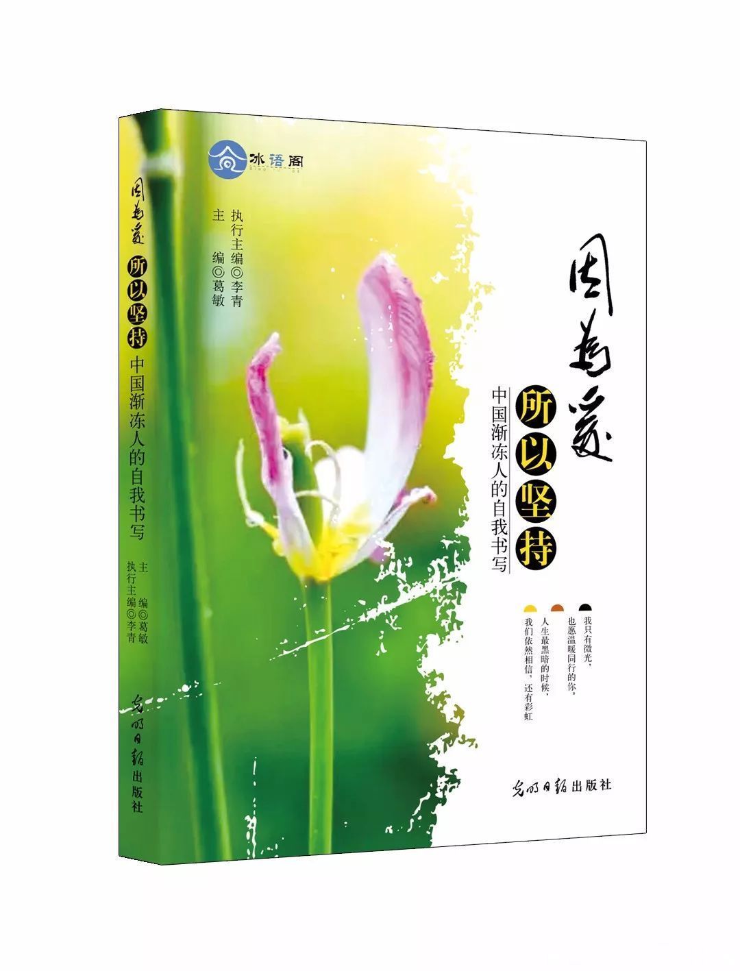 葛敏还将自己的经历汇编成书,以《因为爱,所以坚持》的名字出版。书中讲述了她和其他渐冻人在“抗冻”路上的点点滴滴。一经出版,这本书就引起了社会的广泛关注,包括方俊、于丹、何炅等明星都纷纷为之代言。